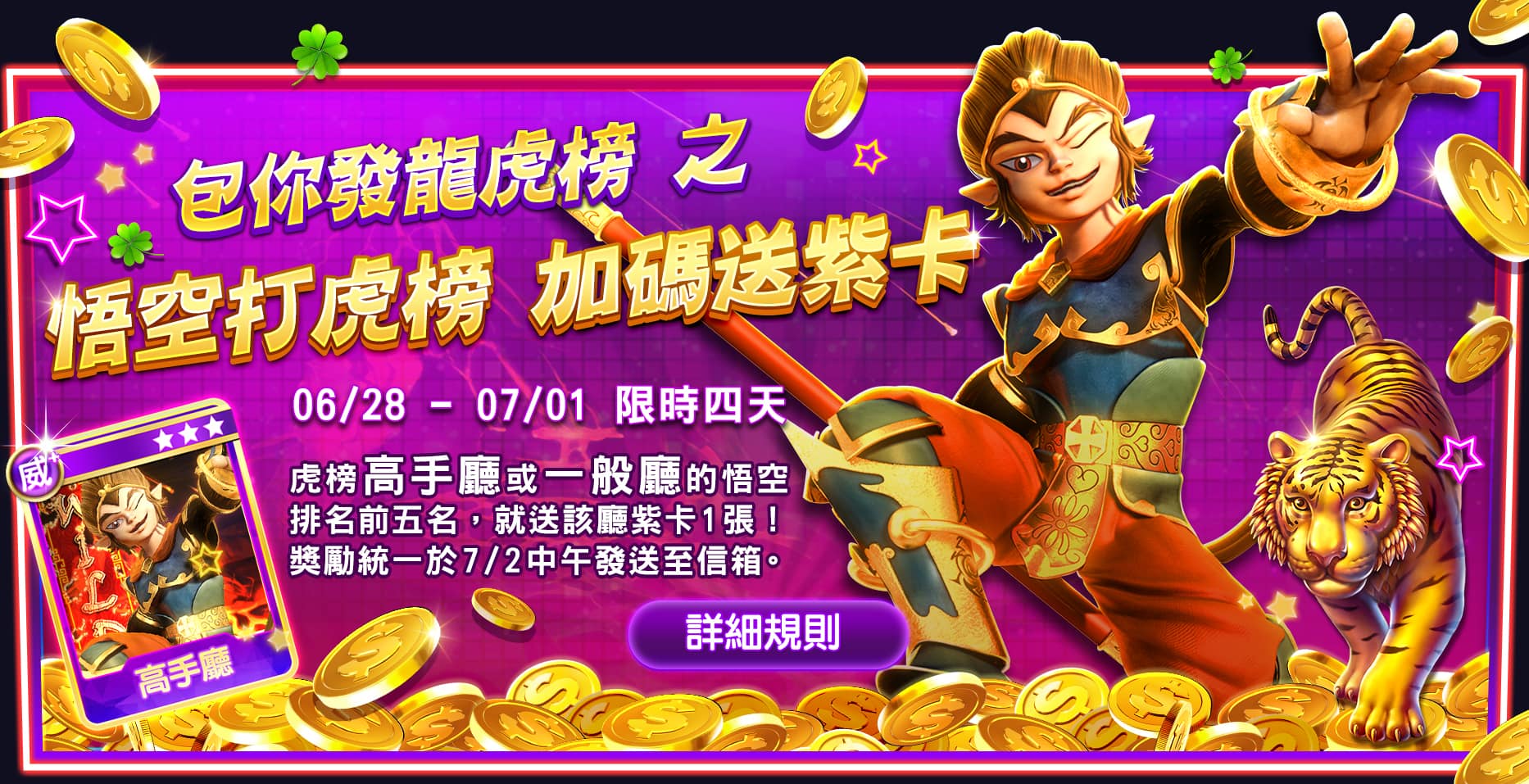 虎榜高手廳或一般廳的悟空排名前五名,通通有獎!就送該廳館紫卡1張!獎勵統一於7/2中午發送至信箱。