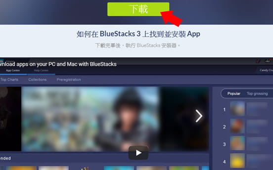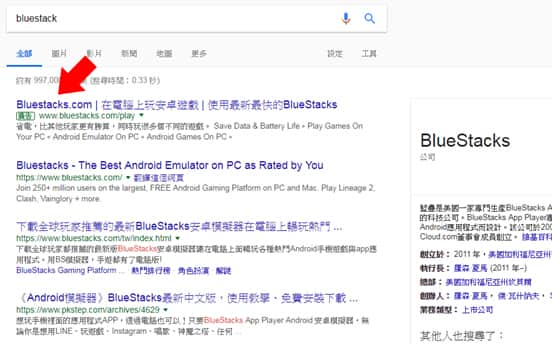 1. 各大搜尋引擎搜尋「bluestack」或「藍疊」,搜尋結果「Bluestacks.com…」開頭的網站點擊進入,準備下載。