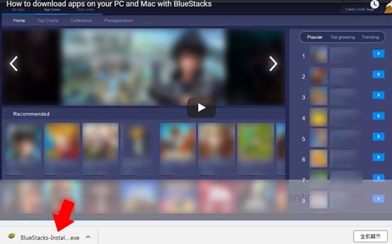 3. 安裝包確定下載完成後,會在左下方顯示「BlueStacks-Install.exe」,點擊下載進入下一步驟。