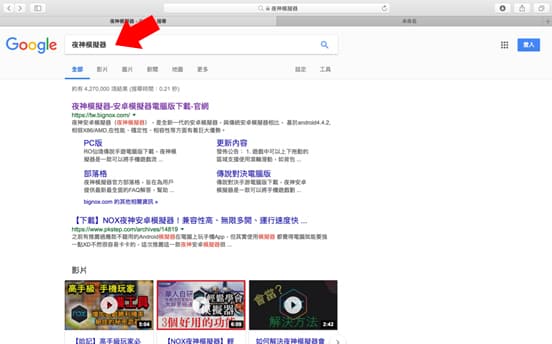 1. 各大搜尋引擎搜尋「夜神」或「Nox」,搜尋結果「夜神模擬器…」開頭的網站點擊進入,準備下載。