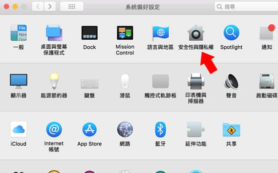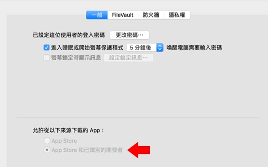 9. 尋找「一般」頁籤並在下方「允許從以下來源下載的App」點選「App Store 和已識別的開發者」項目,方能授權夜神模擬器在蘋果作業系統中執行。