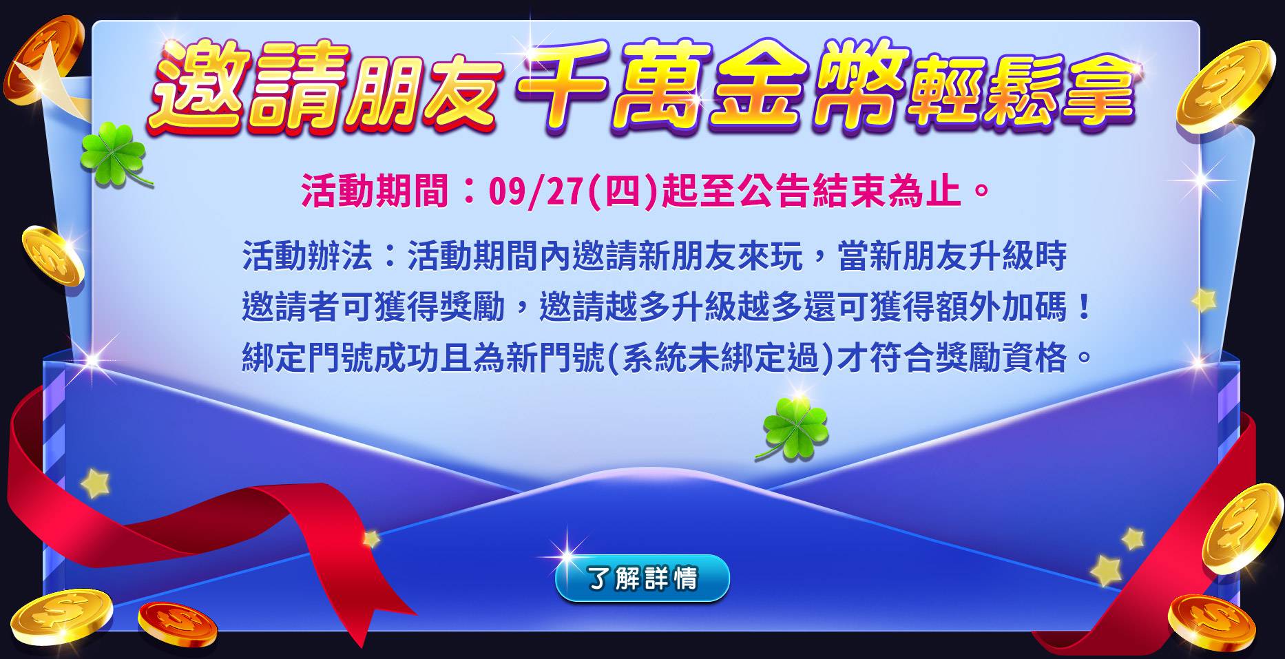額外加碼門檻:邀請新朋友越多且升級越多,獎勵就越大!