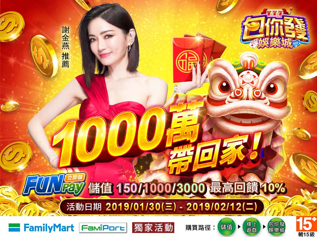 儲值Funpay指定面額,最高享10%回饋 活動時間:1/30(三)~2/12(二) 活動方式:使用『全家立即儲』於『包你發娛樂城』儲值指定面額,最高享10%回饋。(本活動不限儲值次數)。