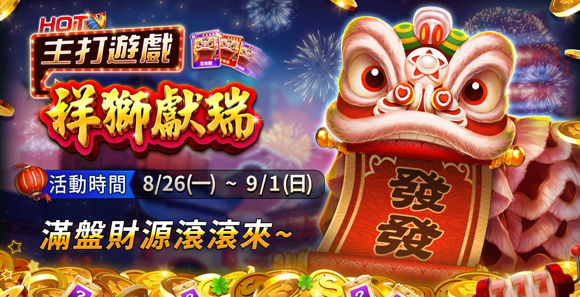 於『祥獅獻瑞主打虎榜』的各廳館排名前二十名!就送該廳館『祥獅獻瑞』威力卡 1張! 虎榜道具卡獎勵將於每日結算後發送至信箱。
