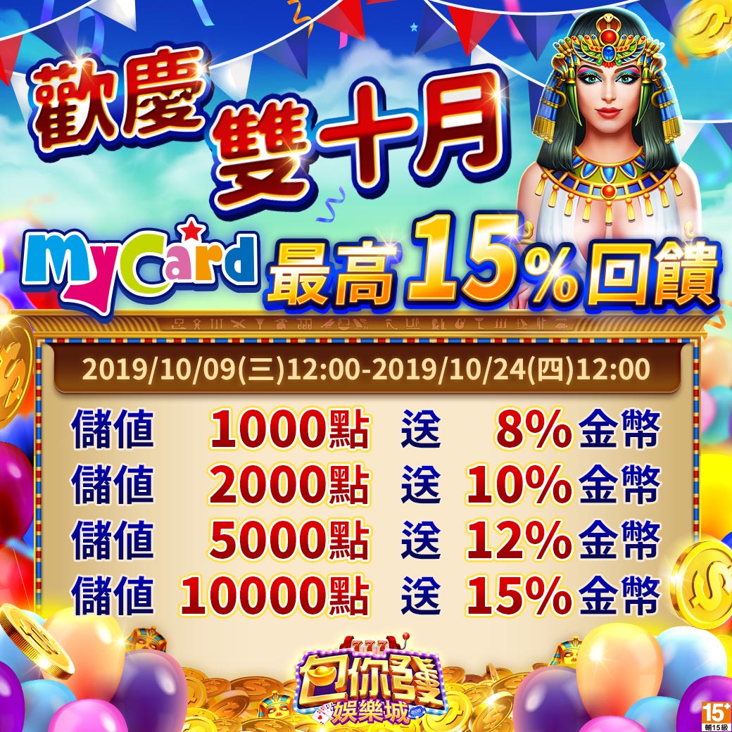 ✦活動方式:活動期間,使用MyCard購買指定面額,並成功儲值至「包你發娛樂城」遊戲帳號內,最高加碼15%金幣,包你財運無雙!