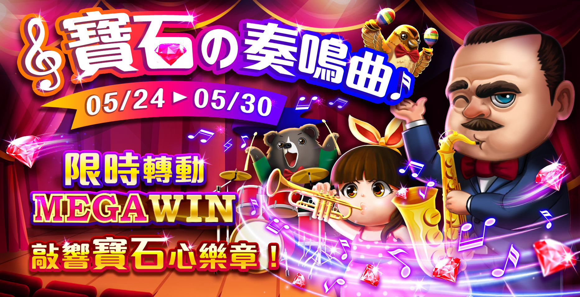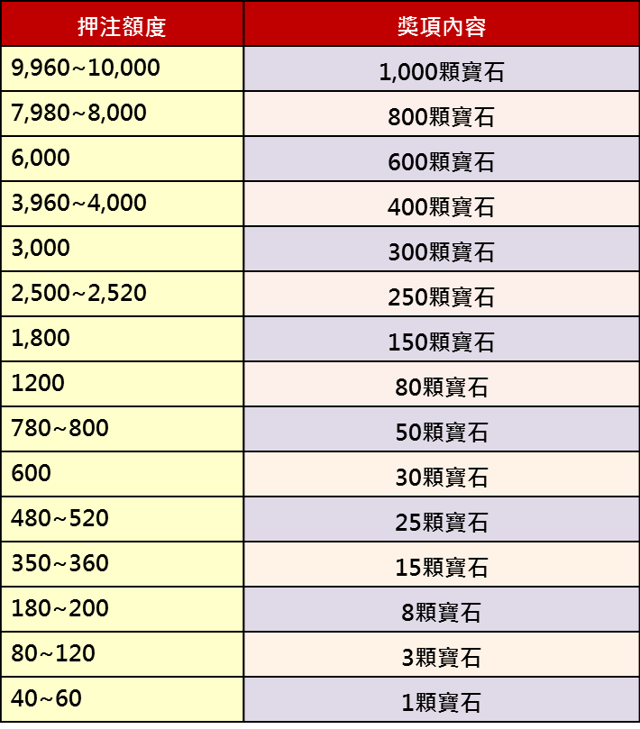 活動期間內進行老虎機遊戲,若於至尊廳、高手廳或一般廳獲得MEGAWIN以上,將依照押注額贈送寶石!親愛的玩家請把握機會,記得每天中午12點到下午2點;晚上7點到10點;凌晨2點到4點,一定要打開包你發娛樂城,並且進入遊戲中遊玩!機會難得,錯過可惜!