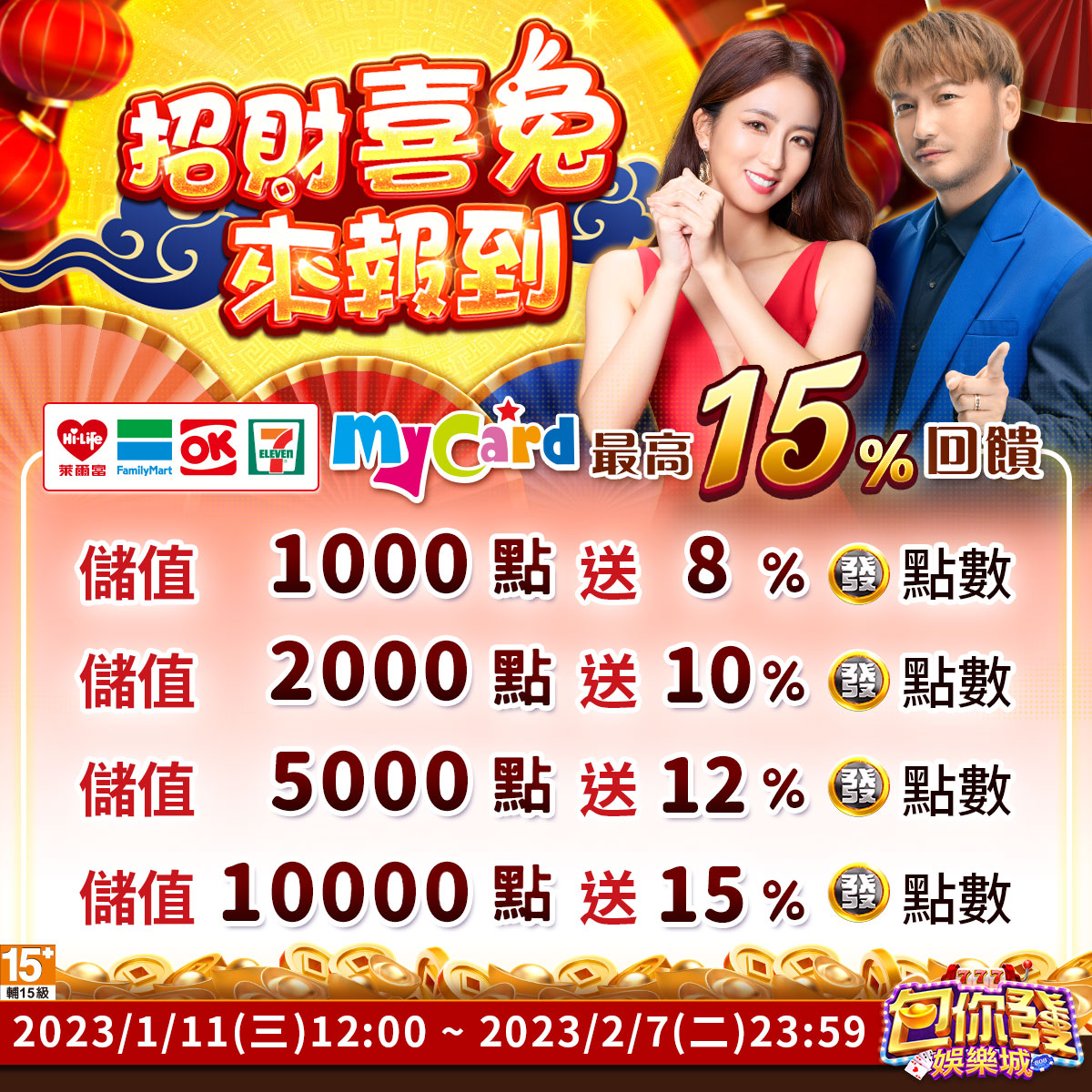 ✦活動方式:活動期間,可於四大超商、【ePLAY店家】、官網【MyCard線上轉點】使用MyCard購買指定面額,並成功儲值至「包你發娛樂城」遊戲帳號內,最高可加碼15%包你發點數!