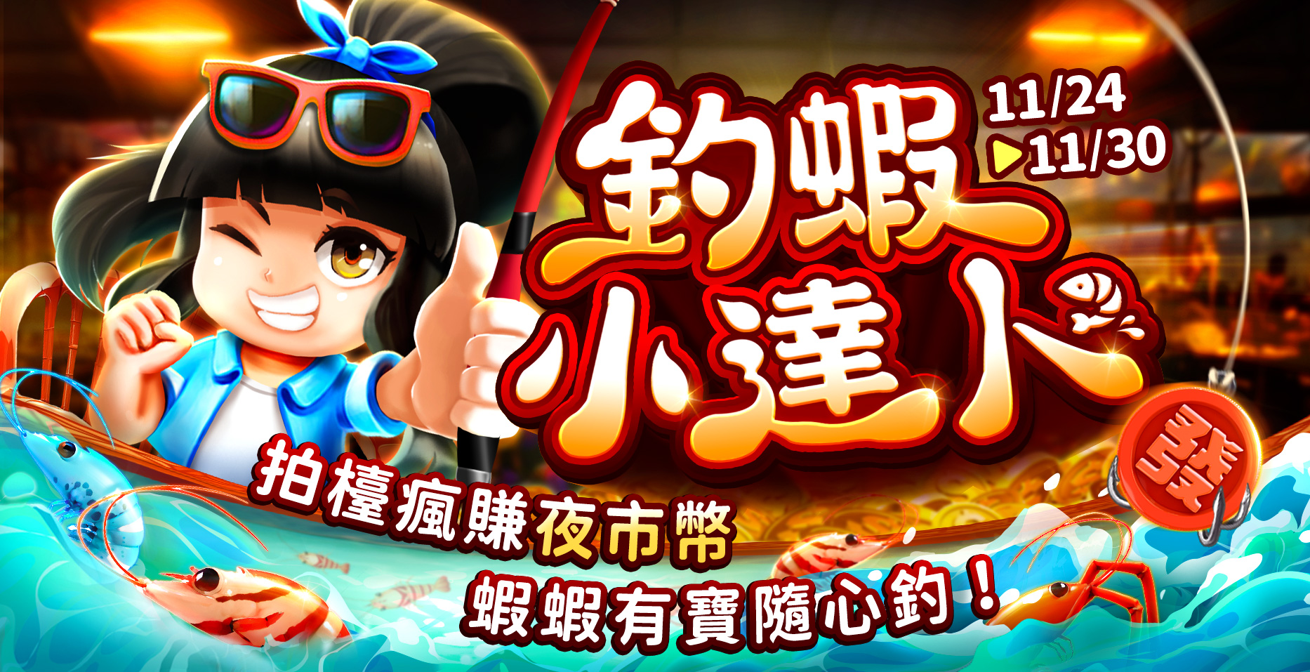 活動期間於各廳館老虎機(體驗廳除外)進行遊戲可隨機獲得包你發夜市幣,玩家蒐集素材包你發夜市幣可於「促咪ㄟ釣蝦」活動頁面兌蝦竿進行釣蝦並兌換獎勵!押注越大,包你發夜市幣掉落機會越高!