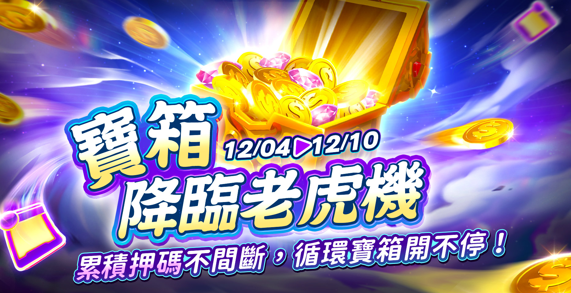 活動期間於老虎機一般廳、高手廳、至尊廳進行遊戲,累積押注加上淨贏分達指定門檻可開啟對應寶箱,寶箱越高級,開到豪華禮品的機會越高!