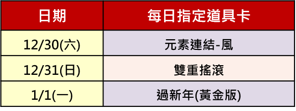 小明於12/31(日)在江山美人一般廳紅包牆活動開出道具卡,當天指定遊戲獎勵為「雙重搖滾」,因此若開出遊戲獎勵卡、威力卡及威力卡+,必定為雙重搖滾道具卡。