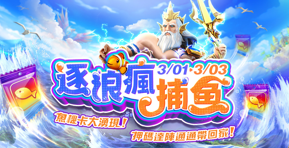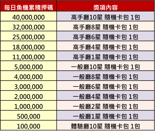 ● 活動辦法: 活動時間內於「財神捕魚」、「激鬥海皇-黃金釣手」、「海皇爭霸-龍鳳傳說」、「海皇爭霸2-奪寶之戰」遊玩,每天累積押碼量達門檻將可獲得指定遊戲隨機卡包!依照每天累積總增加的押碼量,擇優發送一包!每日獎勵將於一個工作日內發送至玩家信箱。