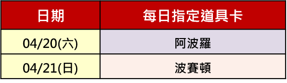 小明於04/20(六)在江山美人一般廳紅包牆活動開出道具卡,當天指定遊戲獎勵為「阿波羅」,因此若開出遊戲獎勵卡、威力卡及威力卡+,必定為阿波羅道具卡。
