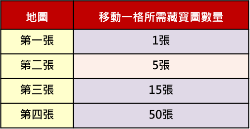 活動期間玩家可於『勇闖金銀島』活動頁面使用獲得的藏寶圖讓海盜小妹往前移動,活動總共有4張地圖,玩家當前的地圖走完即會開啟下一張地圖,每張地圖移動一格皆會扣除不等數量的藏寶圖,如下表所示: