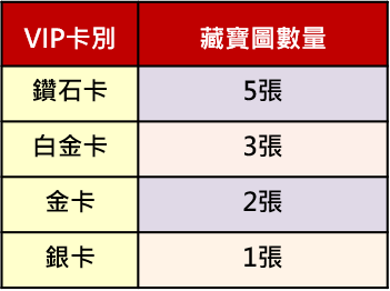 1. 每日晚上00:00後首次登入包你發,即可依據VIP等級不同獲得不等數量的藏寶圖。