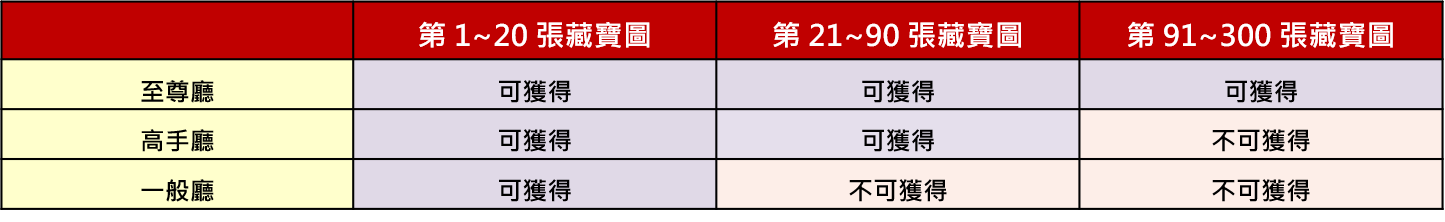 ※ 範例:小明於老虎機一般廳累積積分獲得20張藏寶圖後,因第21張開始一般廳的押碼就不計入積分,若想要繼續累積積分獲得藏寶圖,小明只能遊玩高手廳以上廳館,直到晚上00:00重置後方能在一般廳累積積分。