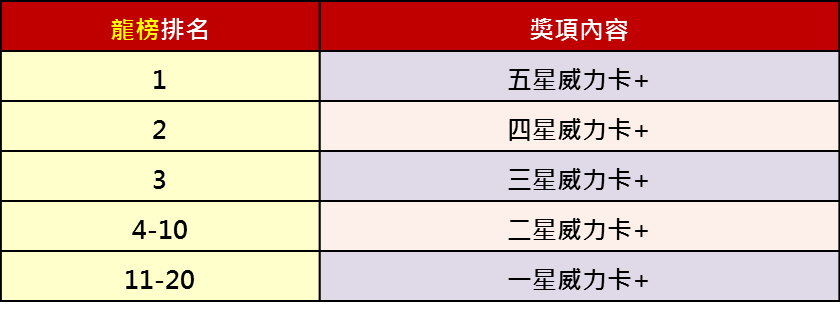 於『金牌射手主打龍榜』的各廳館排名前二十名!就送該廳館『金牌射手』威力卡+1張!龍榜道具卡獎勵將於每週日結算後發送至信箱。