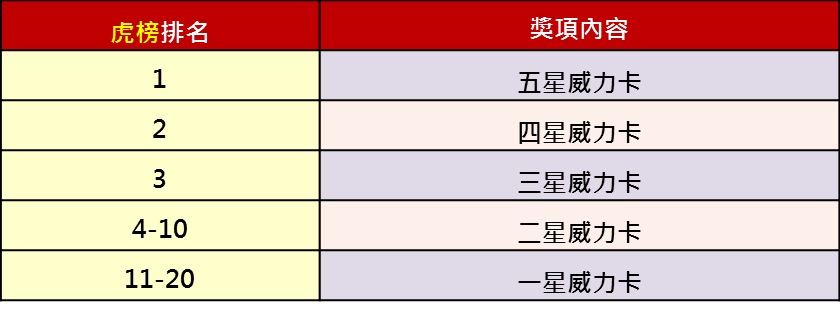 於『金牌射手主打虎榜』的各廳館排名前二十名!就送該廳館『金牌射手』威力卡1張! 虎榜道具卡獎勵將於每日結算後發送至信箱。