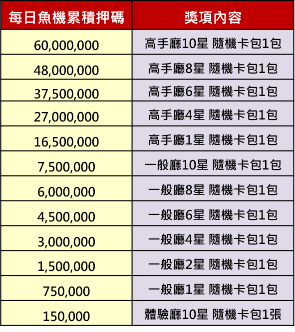 活動時間內於「財神捕魚」、「激鬥海皇-黃金釣手」、「海皇爭霸-龍鳳傳說」、「海皇爭霸2-奪寶之戰」遊玩,每天累積押碼量達門檻將可獲得指定遊戲隨機卡包!依照每天累積總增加的押碼量,擇優發送一包!每日獎勵將於一個工作日內發送至玩家信箱。