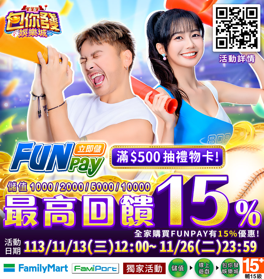 活動方式:使用『全家立即儲』於『包你發娛樂城』儲值指定面額,最高享15%回饋(本活動不限儲值次數)。