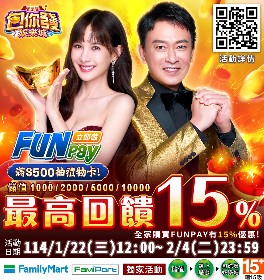 活動方式:使用『全家立即儲』於『包你發娛樂城』儲值指定面額,最高享15%回饋(本活動不限儲值次數)。