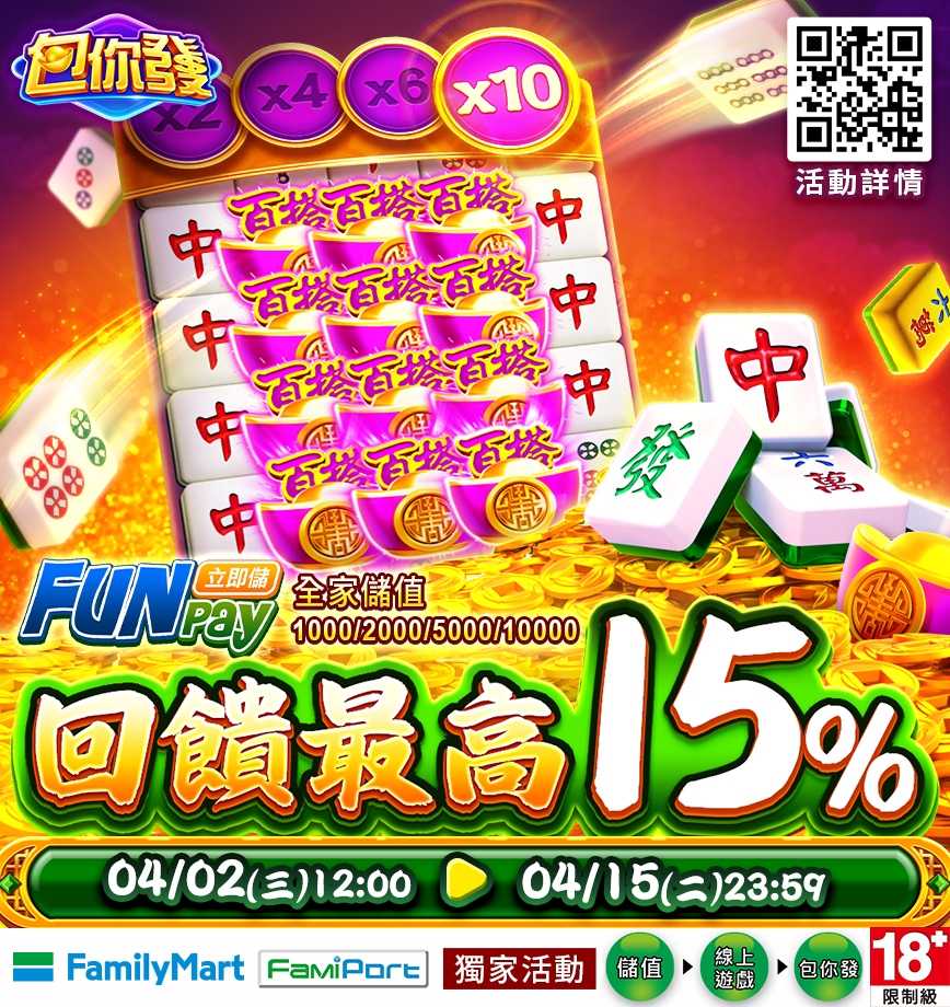 活動時間:114/04/02(三)12:00- 04/15(二)23:59 活動方式:使用『全家立即儲』於『包你發娛樂城』儲值指定面額,最高享15%回饋。(本活動不限儲值次數)。