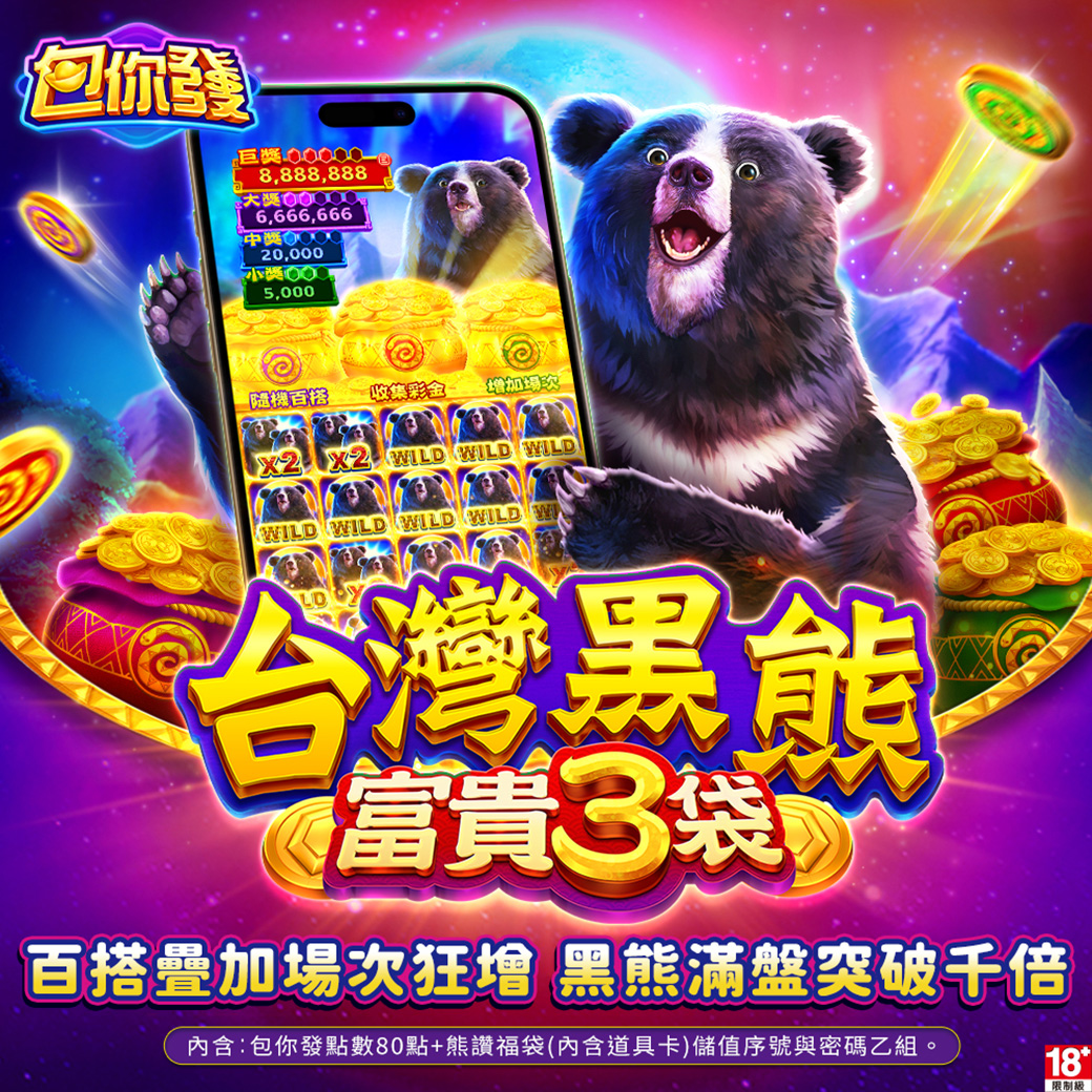 福袋內容:隨機獲得【台灣黑熊 富貴3袋】遊戲之一般廳1~3星或體驗廳5星道具卡(威力卡、威力卡+)1張