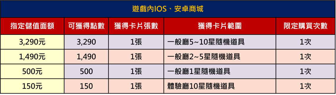 2. 遊戲內安卓、iOS商城 ,每項指定商品每日限定可購買抽卡1次,各指定商品購買次數皆獨立計算且不重置。