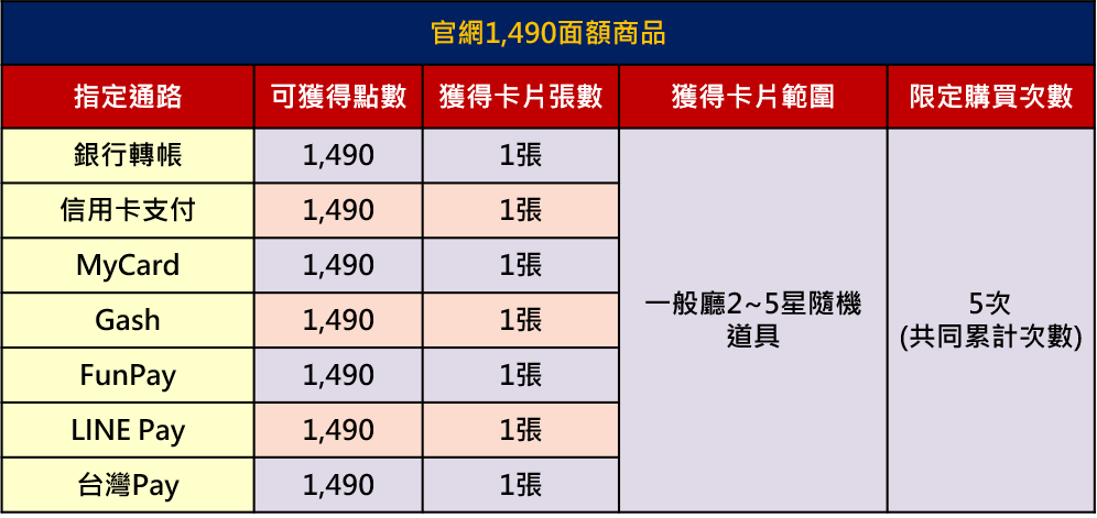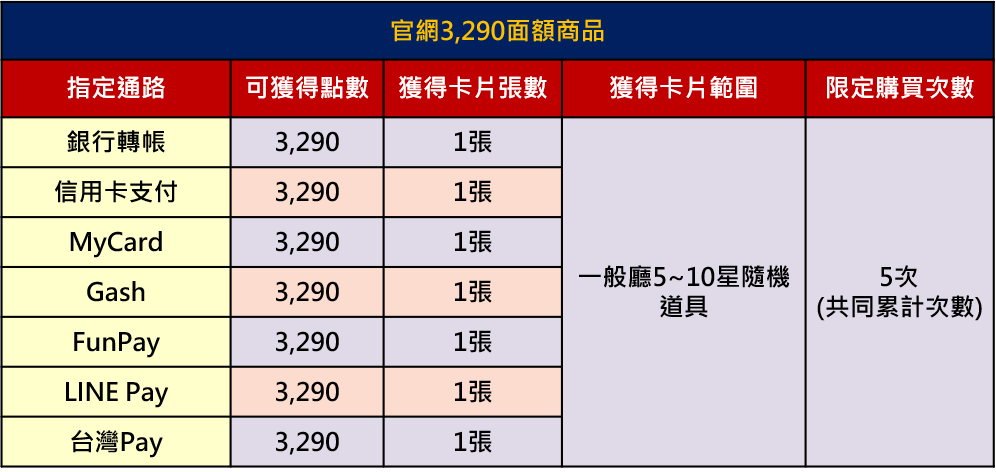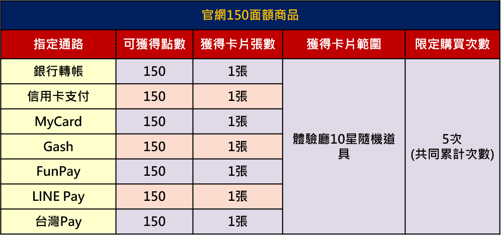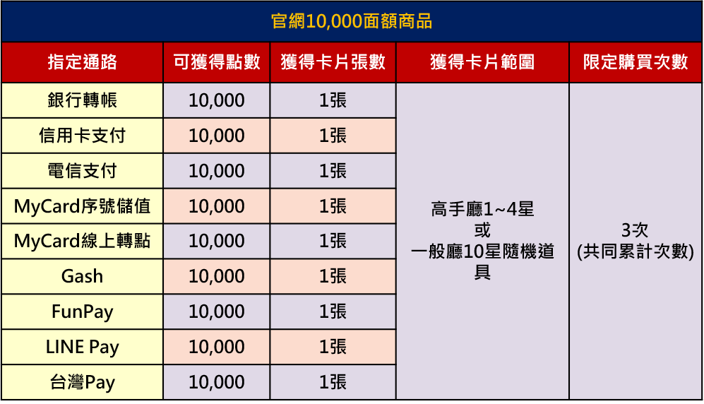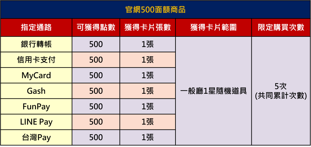 3.官網儲值購點,同面額指定商品每日限定可購買次數為共同計算且不重置。
