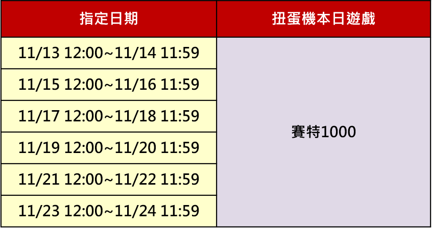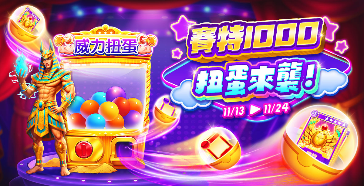 親愛的玩家您好: 為慶祝全新老虎機『賽特1000』上線,即日起【扭蛋機的本日遊戲】將於指定時間開放賽特1000! 活動期間您可使用寶石來進行轉蛋,入手更多賽特1000的卡片!