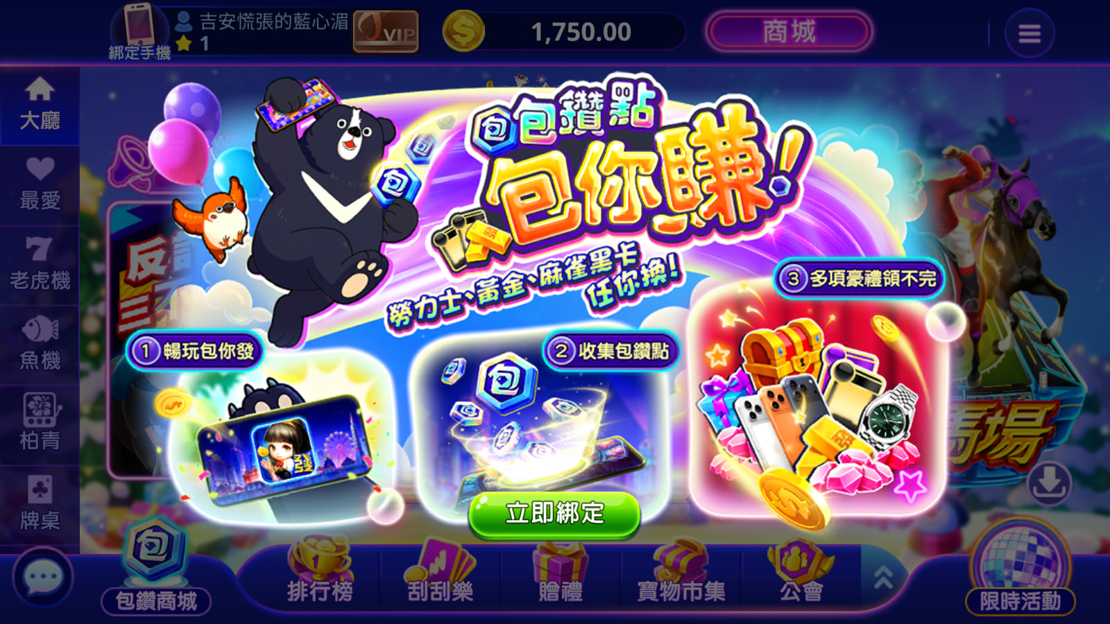 進入包你發大廳後,點選左下角的【包鑽商城】,再點擊【立即綁定】開始進行綁定。