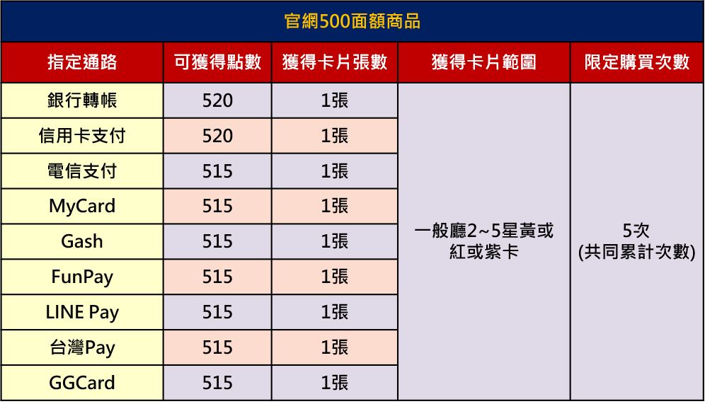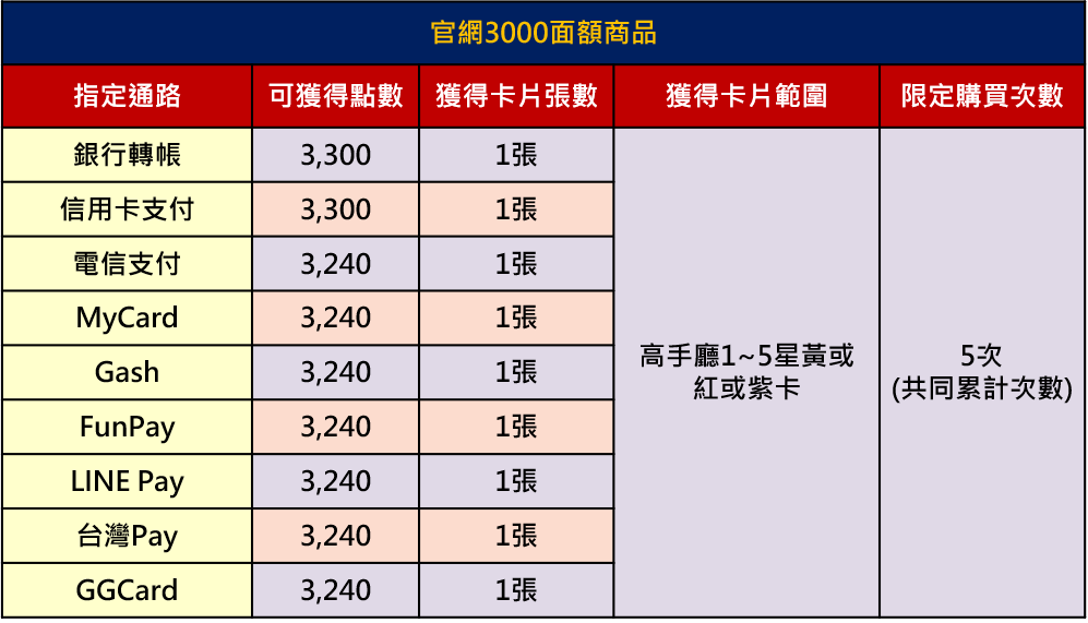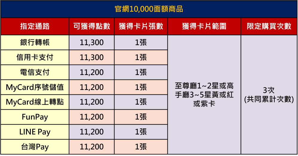 3.官網儲值購點,同面額指定商品限定可購買次數為共同計算且不重置。