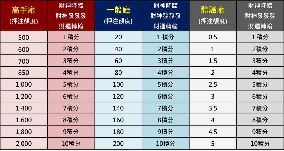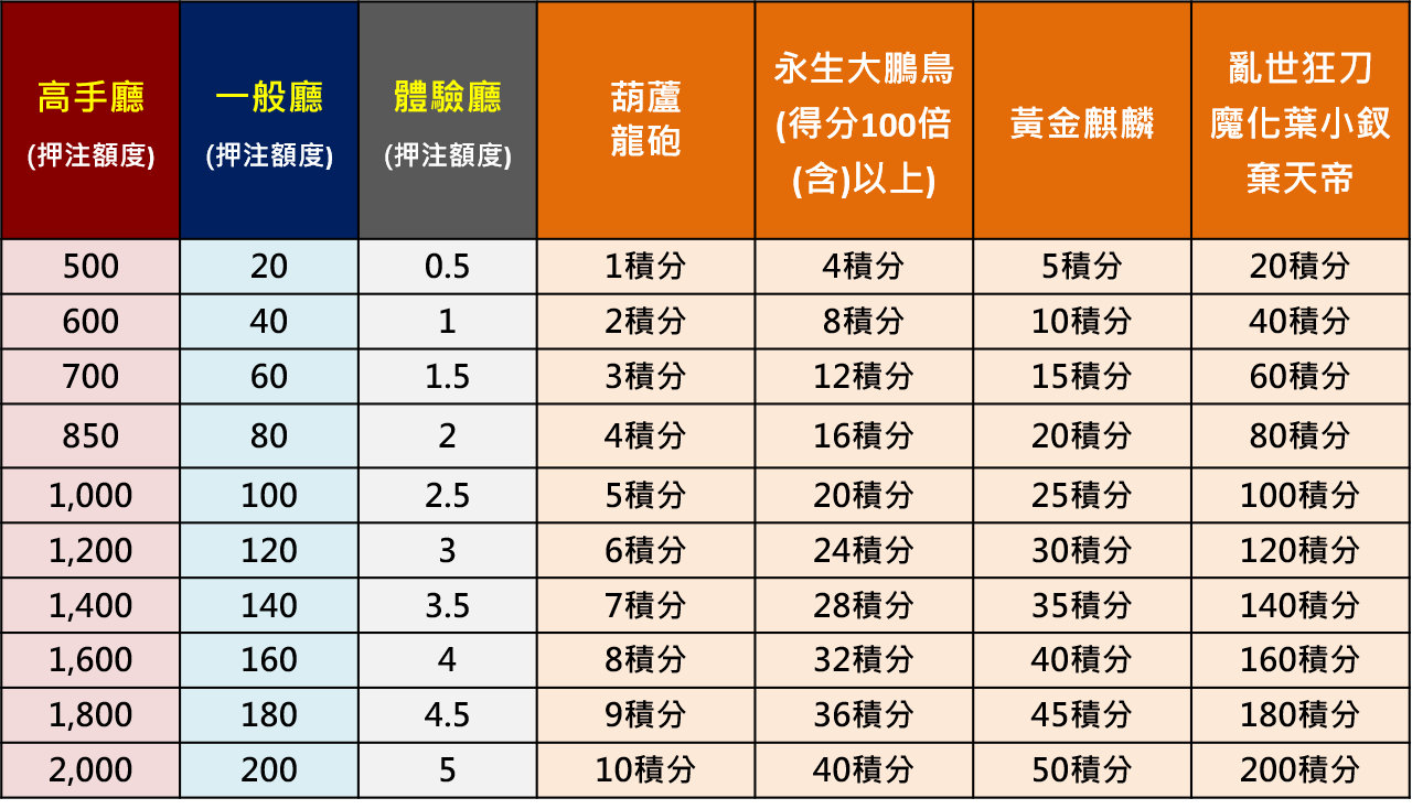4. 玩家發射子彈並獲得大鵬鳥贏分,達原始押注額度的100倍贏分(含)以上,計入一次積分計算,若有使用加押砲投注,則以原始押注額度計算。