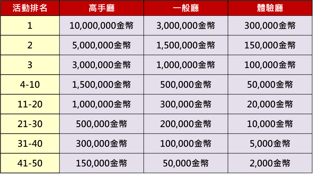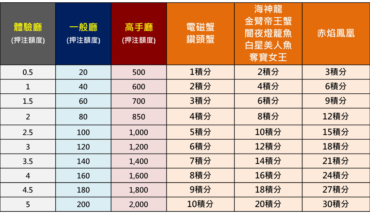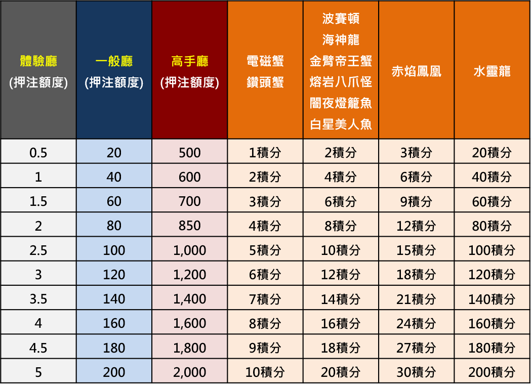 1.活動期間於全魚機進行遊戲累積積分,玩家在指定遊戲達指定條件將依據不同押注量可獲得對應的積分,再由積分進行排行,各廳館魚王積分榜前50名可額外獲得遊戲幣獎勵!獎勵將於週日結算後發送至信箱。