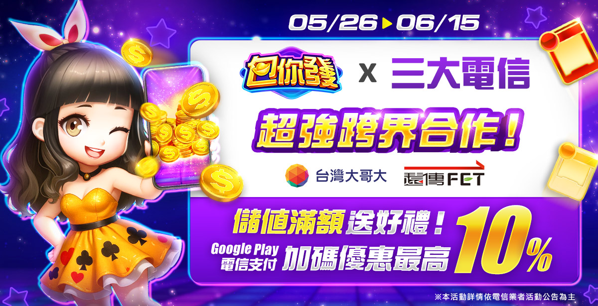 Google play用戶於活動期間,在【包你發】遊戲內使用『電信帳單付款』,